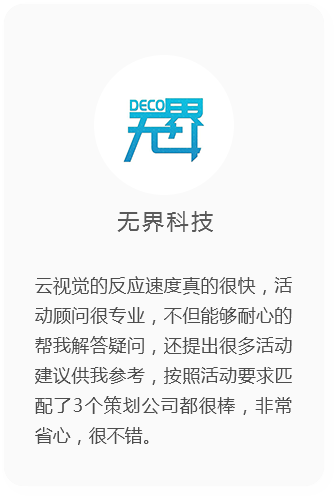 云視覺(jué)匯集海量傳媒公司和傳媒行業(yè)大咖,采用自主研發(fā)的CRM管理系統,通過(guò)大數據方式篩選優(yōu)秀的活動(dòng)服務(wù)商,是您找傳媒公司、找傳媒藝人的高效可靠途徑。